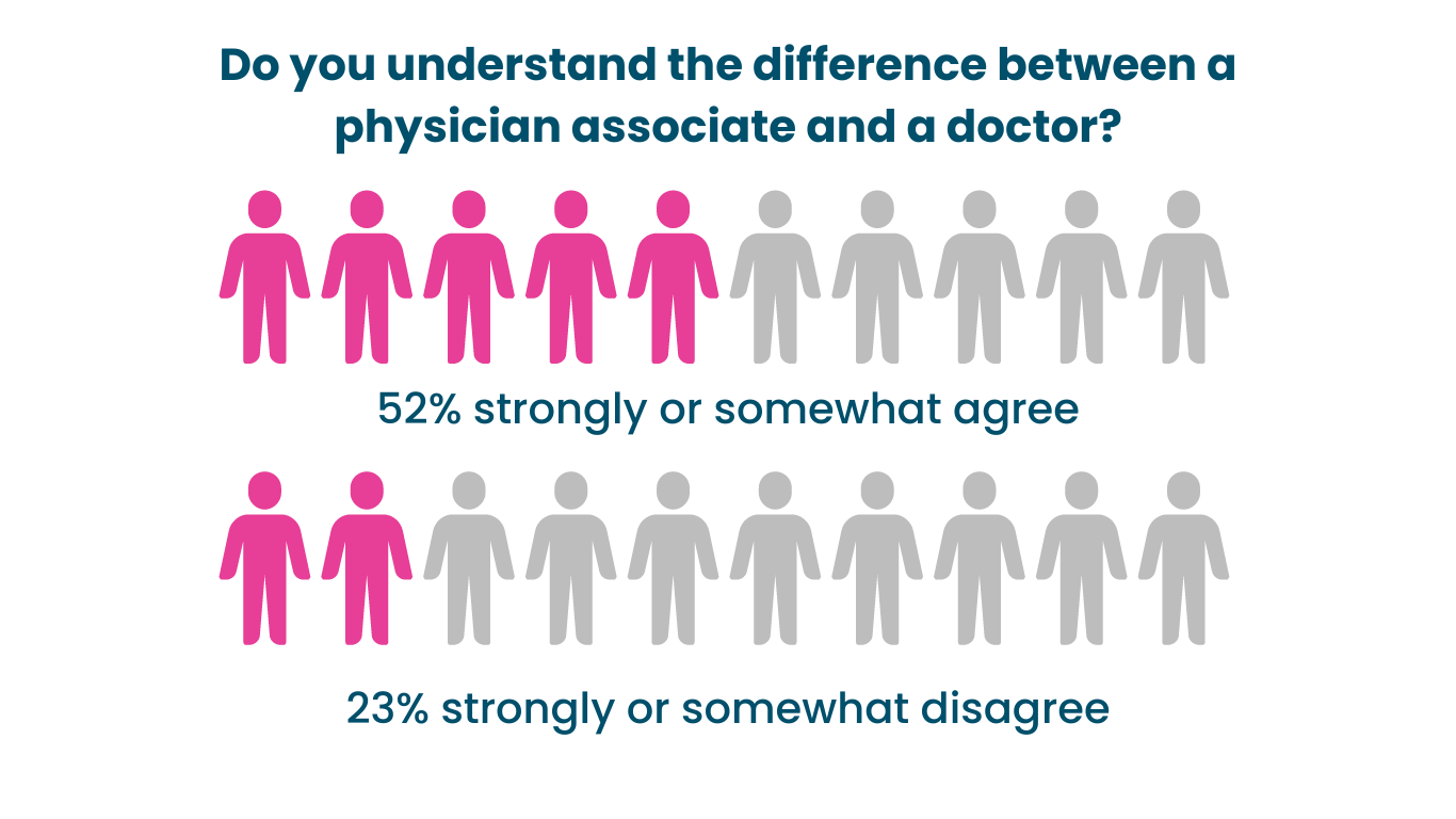 In our polling, we found a mixed picture on awareness of physician associates. Over half of those surveyed (52%) agreed or strongly agreed that they “understood the difference between a physician associate and a doctor”.