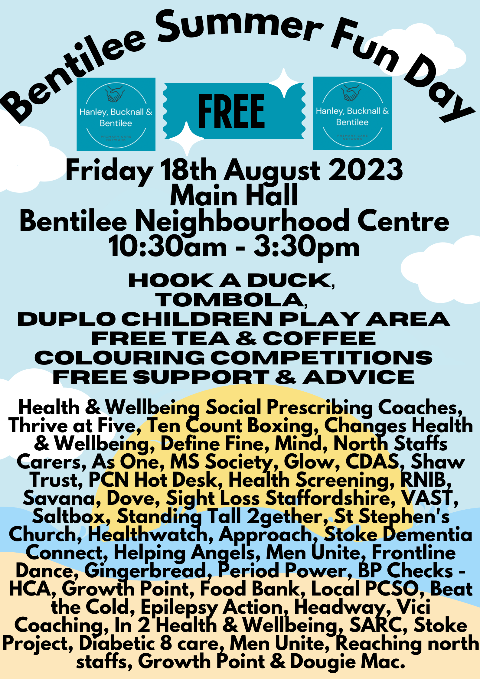 Join us and over 40 other organisations at the Hanley, Bucknall and Bentilee Primary Care Network's Social Prescribing Fun Day! Find out more about each organisation and what support and advice they can offer.